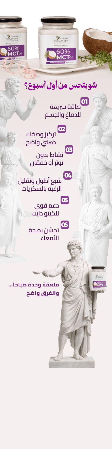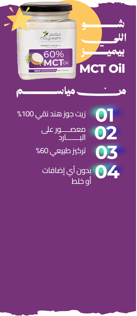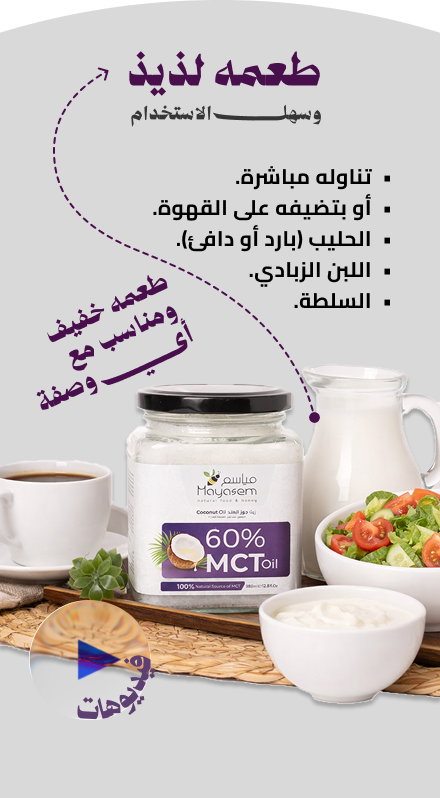 زيت MCT عبارة عن دهون ذكية بحولها جسمك مباشرة لطاقة , بدون تخزين دهون وبدون تعب بالهضم